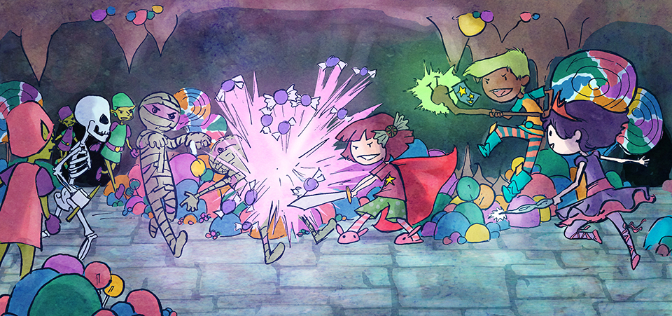 Players explore random caves, fight candy themed monsters, collect candy and find amazing treasures! The levels in Candy Cave are randomly generated for endless variation and fun! The characters and items in Candy Cave are customizable allowing for creativity!*